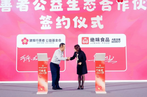 绝味首席营销官伍知琴女士与建辉公益基金会理事长徐红兵先生完成签约仪式
