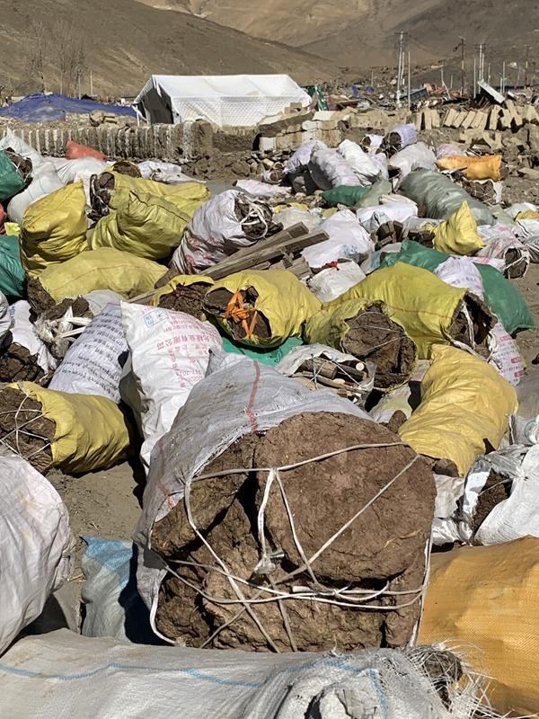 震后,在西藏的许多地方,人们都行动起来,把储存在家中的牛羊粪,一铲铲地装进编织袋。许多村庄、社区的物资捐献点,装满牛粪的编织袋垒得跟房屋一样高。
