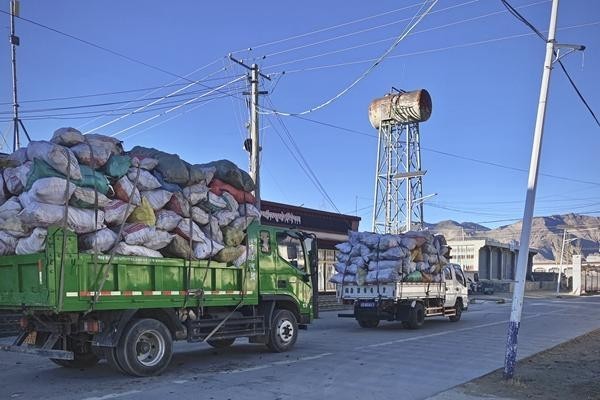 德吉村有40多户人家,家家户户都捐了。有的开着三轮车来,有的开着皮卡、小货车,还有人背着牛粪走过来。有人捐了5袋牛粪,有人捐了10袋,米玛次仁家捐了8袋,整个村子一共捐了约400袋。
