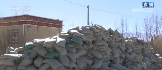 在大门口堆放得像小山一样的是燃料、压缩柴。糌粑、大米、面粉、青稞等比较好保存的粮食类物资大约有3个月的储存量。像肉类和蔬菜类的物资都是分期按需发放,因为村民们自己不好保存。