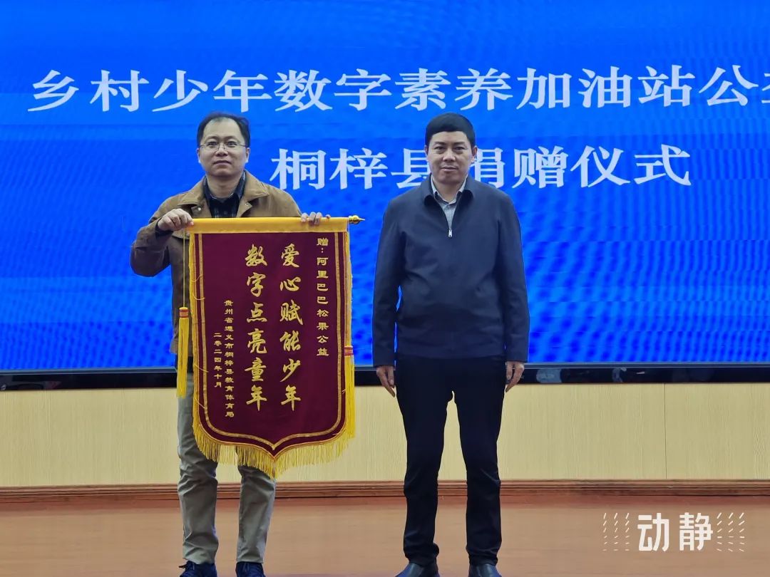 图为桐梓县教体局代表为捐赠方阿里巴巴夸克公益授锦旗。
