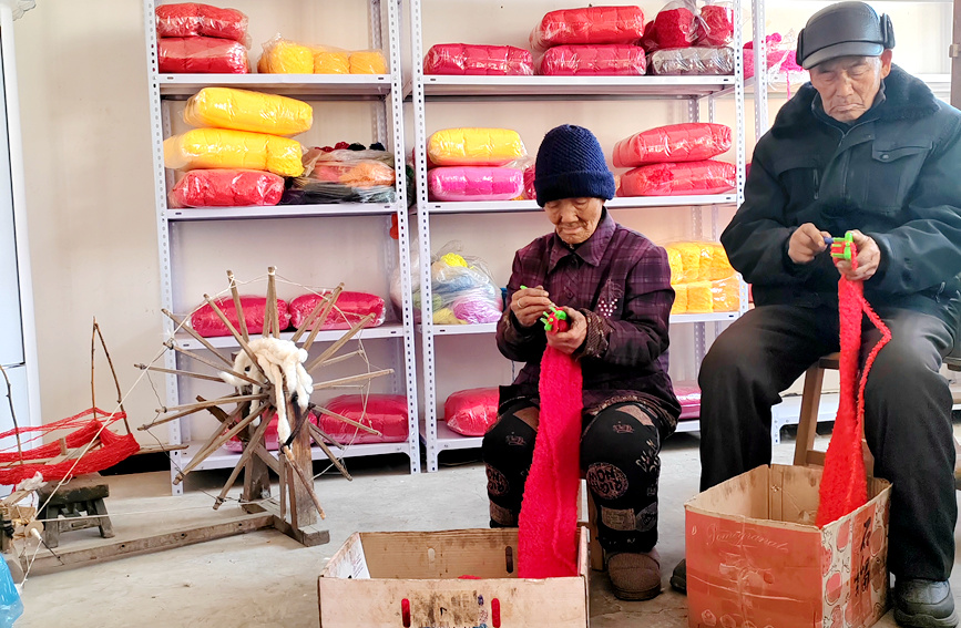 原来,照片上的两位老人是河南安阳的赵中福和张娥梅。今年89岁的赵中福是一名有着60多年党龄的老党员,退休20多年来,他和老伴张娥梅,一有空就织围巾,光纺花车家里已经织坏了好几辆。