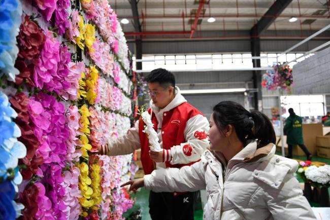 工厂一角,几名女工正熟练地组装仿真花朵。50岁的杨秋红边工作边对记者说:“老板是个工作狂,常说‘把产品做好,心里才有安全感’。比起之前日晒雨淋,现在的工作环境好,收入也稳定。”