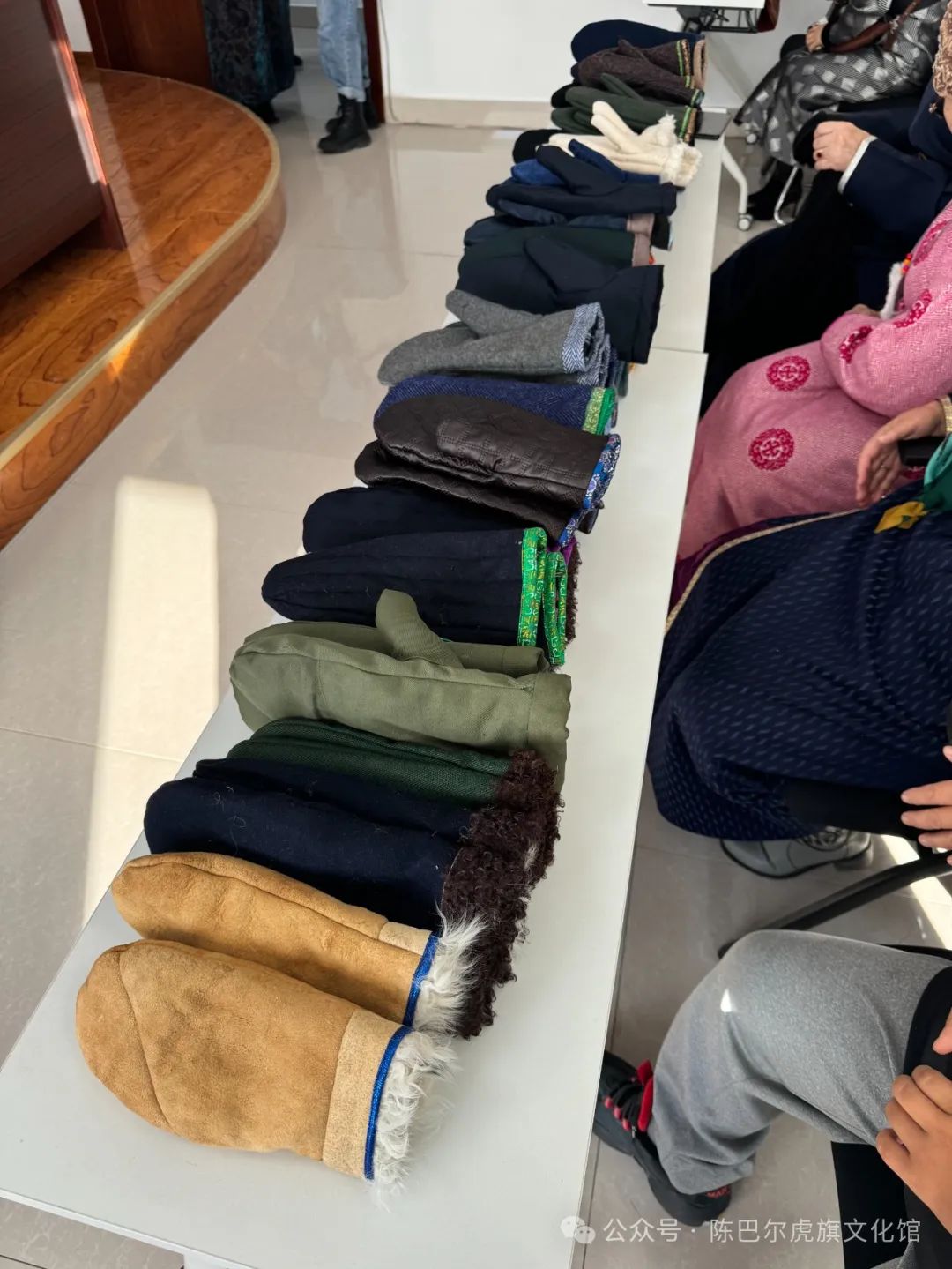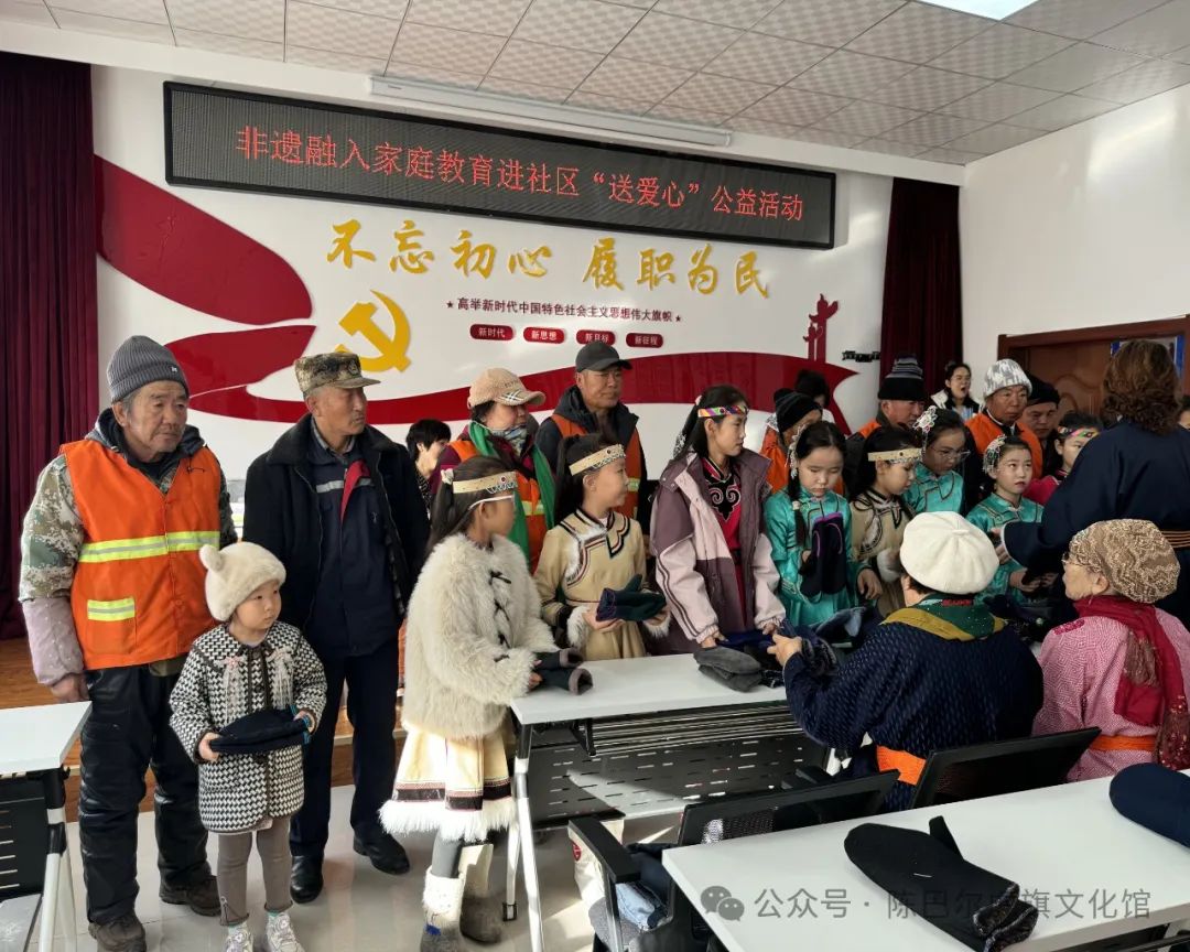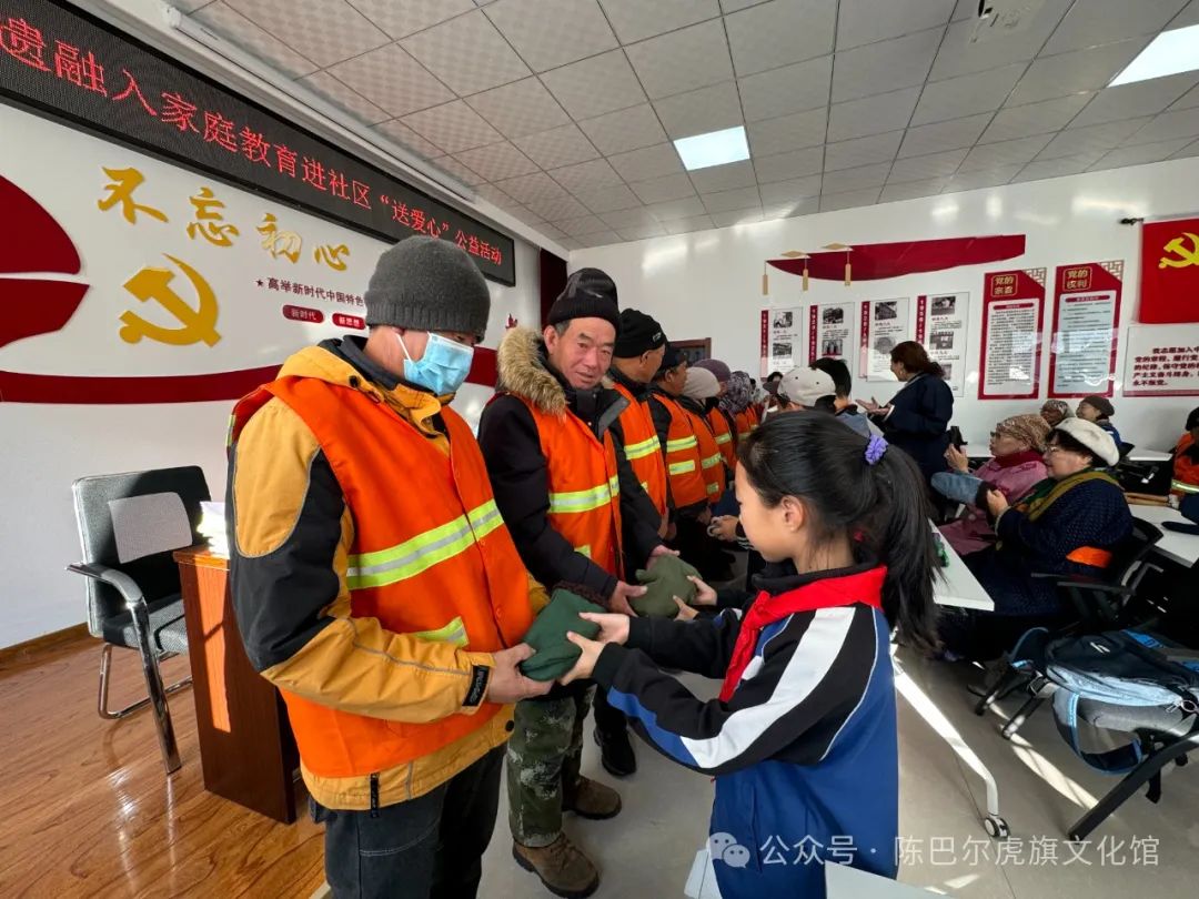 此次非遗进社区献爱心活动由陈巴尔虎旗文化馆、苏优勒社区和内蒙古家庭教育研究会蒙古族传统教育分会三方联合开展。自治区级非物质文化遗产代表性传承人阿拉坦古日古台带领50余名传承人以及民间手工艺人历时15 天制作完成66双棉手套,在活动现场组织孩子们分别献给社区环卫工人,向30余名环卫工人们递去了冬日温暖。