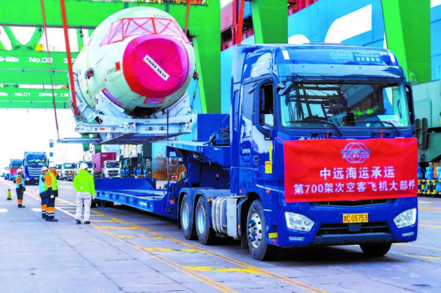 在物流运输领域,中国远洋海运集团有限公司(以下简称中远海运)首创使用集装箱班轮运输飞机大部件的“门到门”解决方案,完成了空客亚洲总装线项目第700架次A320系列飞机大部件全程物流运输服务,支持了空客亚洲总装线的生产和空客全球供应链整合。