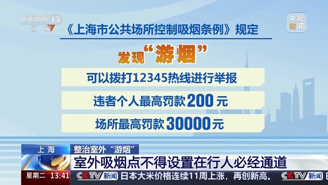 采访中记者了解到,对于二手烟存在的健康风险,不少市民游客建议通过行政处罚等手段,加强对“游烟”的处罚。那么室外的“游烟”行为,究竟能不能处罚呢?记者查询发现,按照《上海市公共场所控制吸烟条例》规定,目前市民游客在幼儿园、中小学校、少年宫、医院、体育场馆、演出场地、文物保护单位,还有人群聚集的公共交通工具等候区域等公共场所,发现“游烟”,可以拨打12345热线进行举报,违者个人最高罚款200元,场所最高罚款30000元。