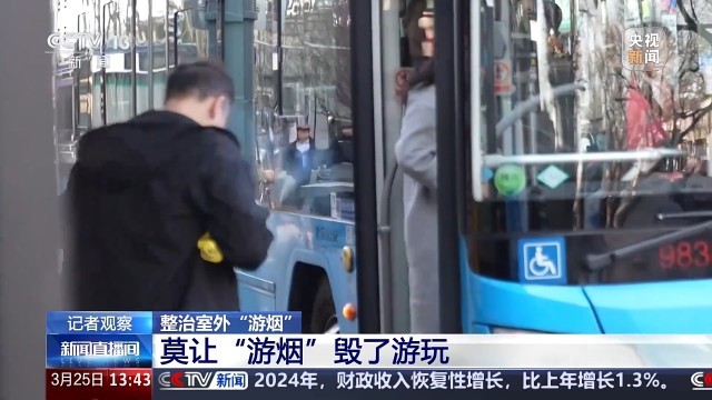 在北京东城区簋街附近一处公交车站,记者记录下这样一幕,一位乘客在公交车站台抽烟,直到车辆进站开门,这位乘客在踏上车辆后才将烟头丢在车下,“游烟”跟随其一起进入车厢,公共交通文明引导员专门去把地上的烟头踩灭,避免消防隐患。