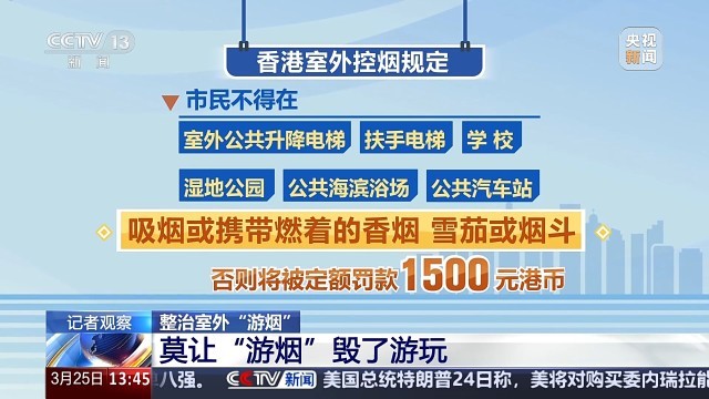 中国疾病预防控制中心控烟办公室原主任姜垣举例表示,我国香港、澳门特区禁烟工作持续开展,形成了社会的广泛共识。比如在香港,要求市民不得在室外公共升降电梯、扶手电梯、学校、湿地公园、公共海滨浴场、公共汽车站吸烟或携带燃着的香烟、雪茄或烟斗,否则将被定额罚款港币1500元。澳门明确公交车站和的士站10米范围内禁止吸烟,公共场所抽烟最高罚款1500澳门元,烟头丢地上罚款600澳门元。