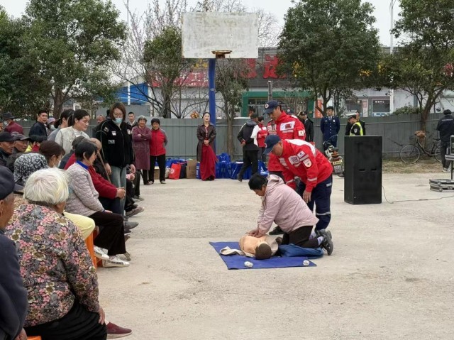 上午8时30分,随着一阵急促的警报声响起,防震避险疏散演练正式拉开帷幕。在党员、消防志愿者的引导下,群众迅速采取“伏地、遮挡、手抓牢”的避震姿势,随后有序撤离至广场开阔区域。紧接着,急救培训与实操环节将活动推向高潮。淮北市红十字救援队专业人员通过模拟人偶演示了心肺复苏术(CPR)和海姆立克急救法,现场还针对农村常见的心肌梗死、脑梗等意外情况进行了应急处置教学。