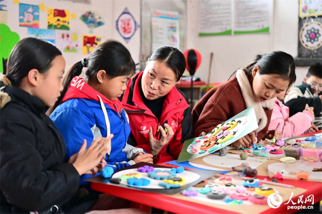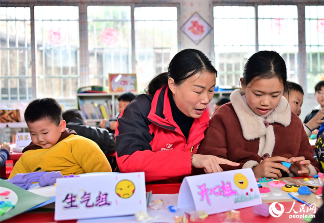 抚州市乐安县湖溪乡梅溪村“幼吾幼”少儿之家,当地慈善总会的志愿者和农村留守儿童一起交流互动,进行趣味粘土手工制作游戏。人民网 朱海鹏摄