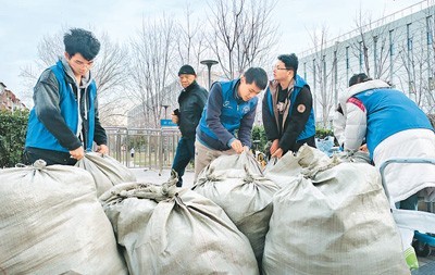 北航蓝协志愿者团队将募集的衣服图书打包。