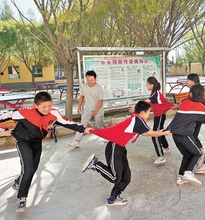 闫泽峰在和学生们做游戏。