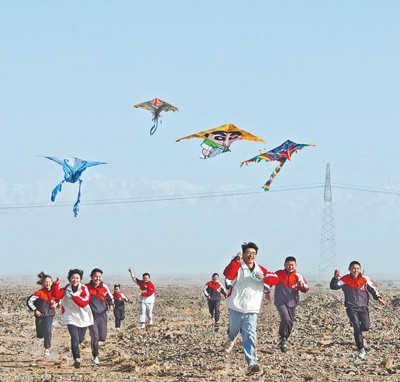 志愿者服务队队员带着学生们一起放风筝。