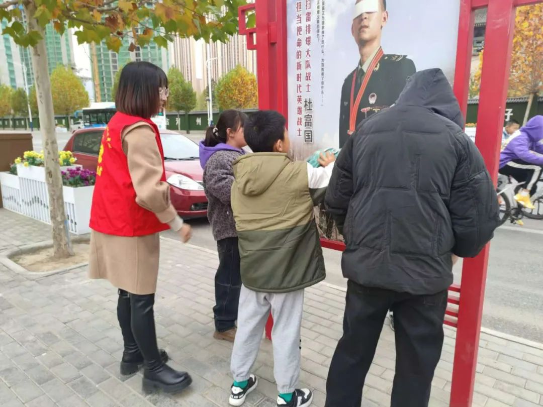 活动中社区工作人员组织孩子们走上街头,对宣传栏及道路边的烟头、垃圾进行清理,他们手拿夹子、扫帚、垃圾袋等工具。两人一组分工合作,有的负责扫、有的负责擦、有的负责捡、有的负责收拢垃圾,让卫生面貌焕然一新。
