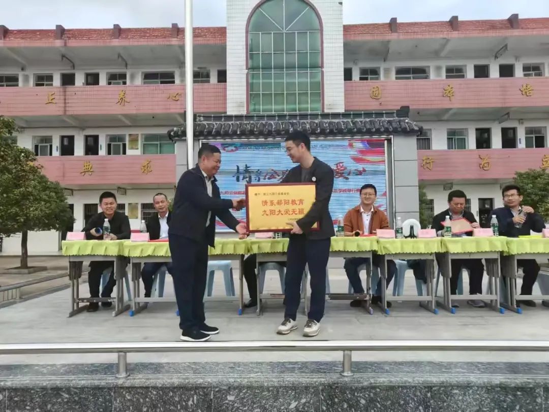 鄱阳县教体局副局长陈太火向九阳公益基金会副秘书长黄晖回赠荣誉牌匾