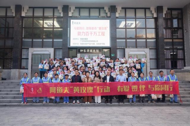 此次活动以“与爱同行,致敬都市‘黄玫瑰’,助力百千万工程”为主题。活动中,阿道夫集团联合广州市宜帝彤贸易有限公司向环卫工人们捐赠了一批爱心物资。