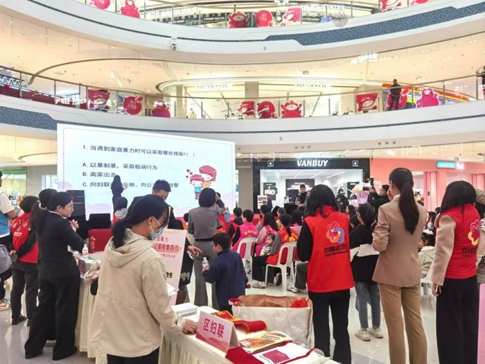 活动当日,平潭吾悦广场中庭布置得温馨而庄重,宣传展板以图文并茂的形式直观展现家暴危害、预防及求助途径,触目惊心的数据与真实案例,引得过往行人纷纷驻足研读。志愿者们穿梭其间,耐心发放反家暴手册,细致讲解相关法规政策,用通俗易懂话语助力大众强化法律意识、识别家暴迹象。
