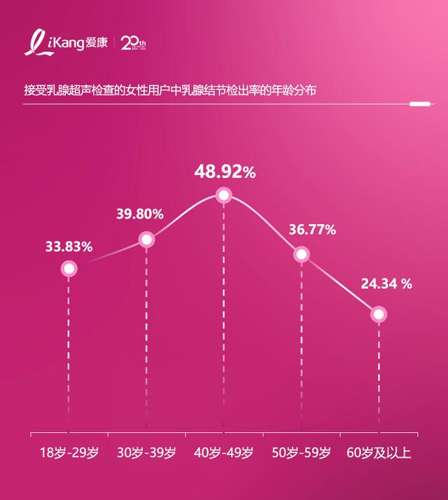 粉红报告统计分析的数据来源于2023年7月1日至2024年6月30日在爱康集团旗下体检中心参加体检的338.02万人次成年女性体检用户(18岁及以上)。其中90%的成年女性参加了乳腺相关检查(包括乳腺外科检查、乳腺影像检查、乳腺癌相关肿瘤标志物检测和乳腺癌易感基因检测),约77%的成年女性参加了乳腺超声检查。