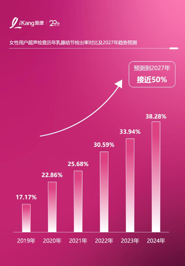 这一趋势在未来短期内亦很难按下“暂停键”,在不考虑人口年龄结构、国家卫生政策及其他影响因素变动的情况下,爱康预测显示:到2027年,乳腺结节检出率预计可能接近50%,两女必有一“结”的时代即将来临。