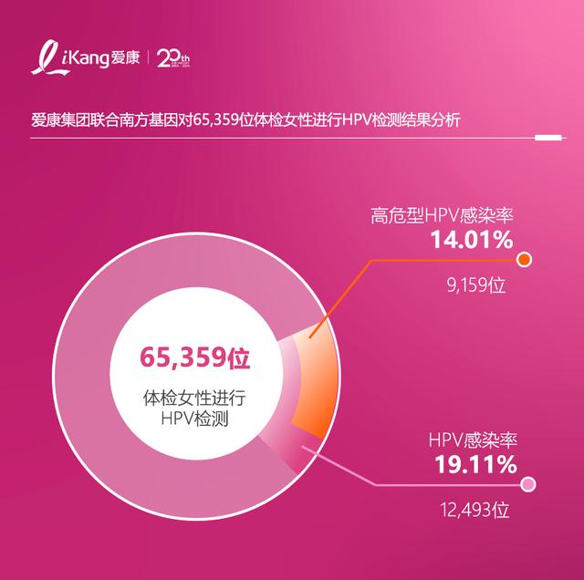 女性恶性肿瘤中,宫颈癌的存在同样不容忽视,在我国的发病率位居TOP5。高危型HPV病毒的持续感染是宫颈癌以及癌前病变的必要因素。但为什么有些人感染了不会得宫颈癌、有些人会得宫颈癌?研究表明一部分人群被感染后,HPV病毒的DNA整合到人体自身的基因组中,破坏人体的基因组以及染色体结构,导致了致癌基因的激活以及抑癌基因的失效,这是导致宫颈上皮细胞恶性转变的关键环节。2023年3月1日到2024年7月4日,爱康联合南方基因对65,359位体检女性进行了HPV病毒的DNA整合检测,结果显示有近2成女性感染HPV,其中14.01%感染高危型HPV。对于感染了高危型HPV的人群,11.35%出现了HPV病毒的DNA整合,对于这些人群需要高度监测宫颈癌的风险。