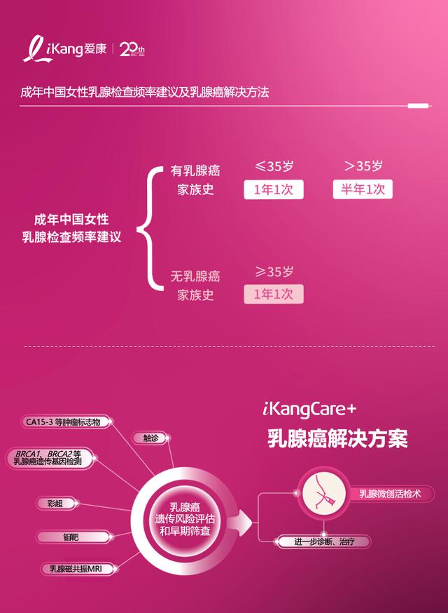 爱康建议:中国女性从35岁开始,乳腺检查频率应为一年一次;如果年龄>35岁,且有乳腺癌家族史的女性,建议缩短到半年一次;如有BRCA基因突变的女性,需要从18岁开始定期筛查。在触诊的基础上,选择乳腺超声检查、乳腺钼靶检查、乳腺磁共振MRI检查、肿瘤标志物等有针对性的检查。