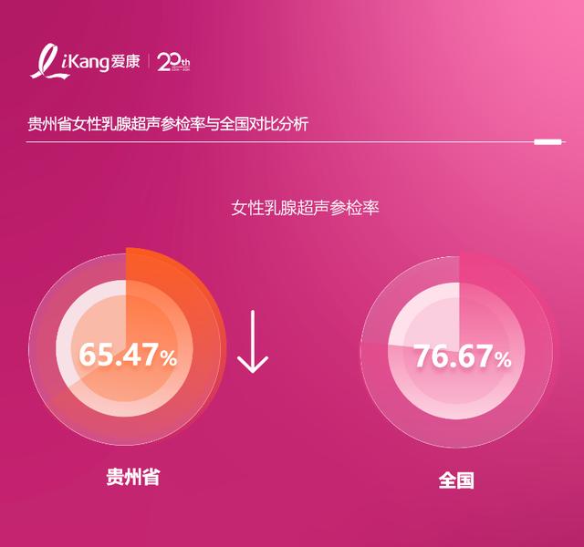 粉红报告显示,全国乳腺超声参检率约77%,贵州省15.06万人次成年女性体检用户中只有11.77万人次参加乳腺相关检查,9.86万人次参加乳腺超声检查,乳腺超声参检率约为65%,低于全国平均。