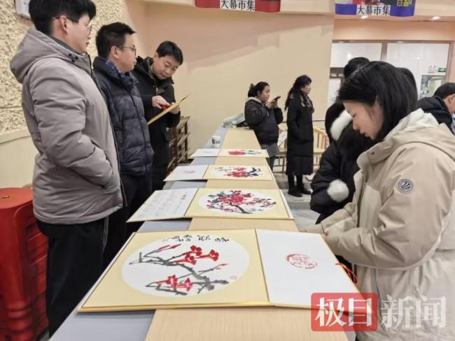 另一边,女画家孟清的以藤黄朱磦调曙红点染柿脸,略蘸清水晕出柿底,一个个饱满鲜活的柿子便跃然纸上。“‘柿’谐音‘事’,祝您事事如意、家庭幸福!”孟清将画作赠予73岁的桃花尖村村民章新尖,老人接过这份特殊的新春祝福,眼角眉梢都漾着幸福。小半天工夫,图书馆的桌上、地上便晾满了春联与画作,喜庆的红色映红了场馆,也映红了村民们的脸庞。
