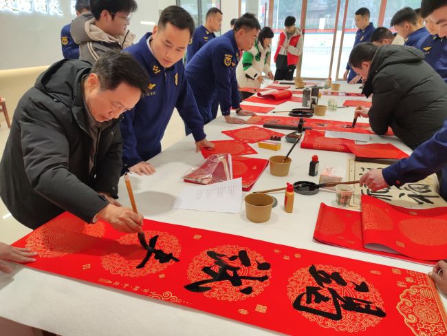 现场消防救援人员踊跃参与活动,不少队员还在书画老师的悉心指导下亲自提笔体验,在笔墨挥洒间感受中华优秀传统文化的独特魅力,现场互动热烈、氛围温馨愉悦。