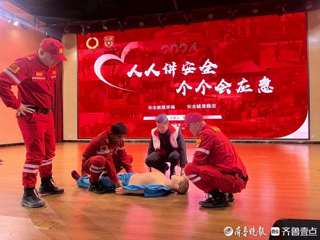 在互动环节,6名学生上台参与了应急知识实操培训,学习了海姆立克急救法、人工呼吸、查看脉搏起伏情况等技能,以增强在紧急避险情况下的自救能力。