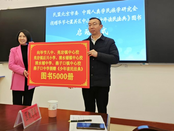 12月19日,“民盟北京市委 中国人类学民族学研究会捐赠毕节七星关区中小学《少年读民法典》图书”启动仪式举行。此次活动旨在提升当地中小学生的法治素养,推进法治教育普及。民盟北京市委专职副主委田庆奇,毕节市政协副主席、民盟毕节市委主委刘祖荣,《少年读民法典》图书主编、中国社会科学院副研究员、中国人类学民族学研究会理事方鸿琴,中国人类学民族学研究会副秘书长、贵州民族大学教授、博士生导师郝亚明,七星关区教育局党组成员、教育事务服务中心主任周礼康出席捐赠仪式。民盟贵州省委专职副主委黄琳主持。民盟贵州省委社会服务处一级调研员雷吉华,民盟北京市委社会服务部副部长(主持工作)李莉,七星关区政协副主席、民盟七星关区工委主委熊秀,民盟北京市委企业家工作委员会副秘书长、国务院国有资产监督管理委员会有色金属机关服务中心资产经营处主管胡胜,亮岩镇中心校、亮岩镇后川小学、清水铺镇中心校、清水铺中学、燕子口镇中心校等学校代表共同参与见证。