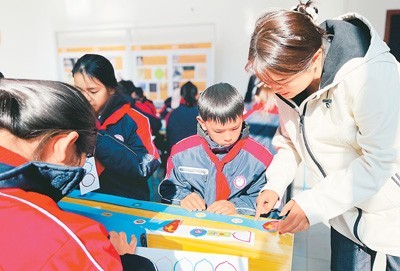 一旁,东山乡中心小学校长兰桂宁正在一套数字排序展品前耐心指导学生完成计算。不同于单纯展示科学原理的科普展品,这样的计算需要学生运用一定的数列组合知识,吸引了不少高年级学生兴致勃勃地前来“答题”。