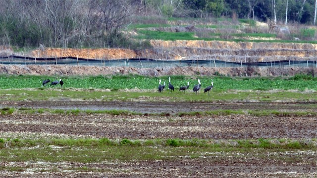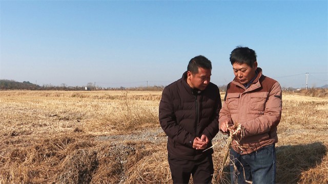 东至县香隅镇金鸡村干群在周家湖湖田查看候鸟口粮。叶路摄