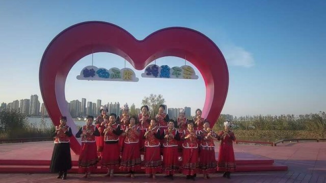 在淮河安徽蚌埠段龙子湖岸边,七旬蚌埠市居民齐桂林和老年朋友们身穿统一民族服饰,一口气排练了好几首葫芦丝曲目,她们成为淮河边一条靓丽的风景线。