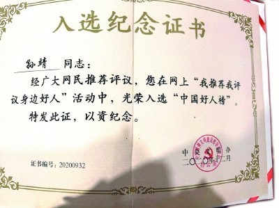 记者在鞋店的架子上看到了一大摞慈善捐赠证书,有区级的、市级的,还有中国红十字会颁发的。2020年,在中央文明办组织的“我推荐我评议身边好人”活动中,孙靖当选为“中国好人”。